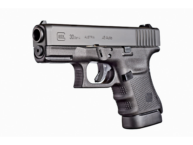 While the Glock 30 Gen4 is not as “pocketable” as other GLOCK subcompacts, it does pack 10 rounds of threat-stopping .45 AUTO in the magazine. Measuring 6.88 inches in length, 4.8 inches in height, 1.27 inches in width and 26.3 ounces in weight, the original Glock 30 was introduced back in 1996 as a variation of the standard-sized GLOCK 21. The Gen4 version (introduced in 2012) offers interchangeable backstrap panels, the same 10+1 capacity, the new dual recoil spring assembly and an accessory rail.