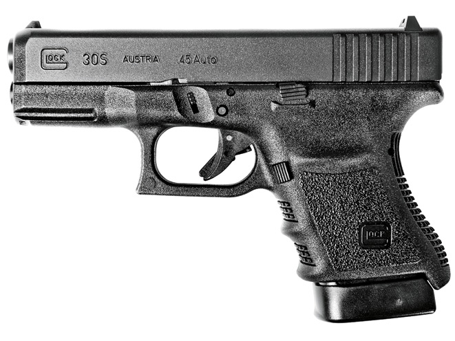 The GLOCK 30S is a hybrid .45 AUTO model introduced in 2013 that combines the slide from the six-round-capacity Glock 36 with the larger 10-round-capacity Glock 30 SF frame, thereby creating a smaller .45 AUTO without compromising capacity while at the same time adding an accessory rail. The pistol has a 3.77-inch barrel, an overall length of 6.96 inches, a width of 1.27 inches, a height of 4.8 inches, and an approximate unloaded weight of 22.95 ounces.