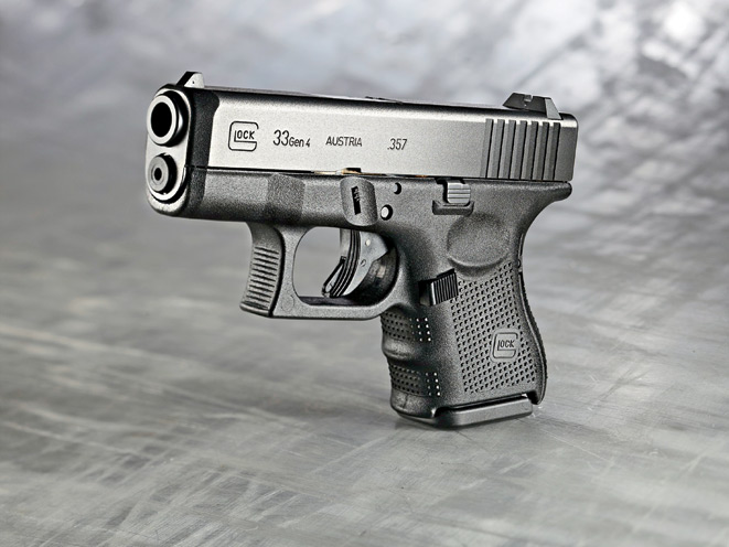 Back in 1997, just four years after the .357 semi-auto cartridge was developed for law enforcement use, GLOCK introduced the subcompact Glock 33, the compact Glock 32 and the standard Glock 31. This was an immediate trio of guns that allowed law enforcement officers to have two primary carry options, plus a matching backup gun, all in the same new caliber. The .357 remains mostly a law enforcement specialty even today, but the latest Glock 33 Gen4 (as well as Gen4 versions of the Glock 31 and Glock 32) offer users all the latest advances in grip design and recoil management in this specialized high-performance caliber. The 9+1 capacity Glock 33 Gen4 measures 6.41 inches in overall length with a 3.42-inch barrel, a short 4.17 inches in height, 1.18 inches in width and 21.89 ounces in weight, making it the size equivalent of the Glock 27.