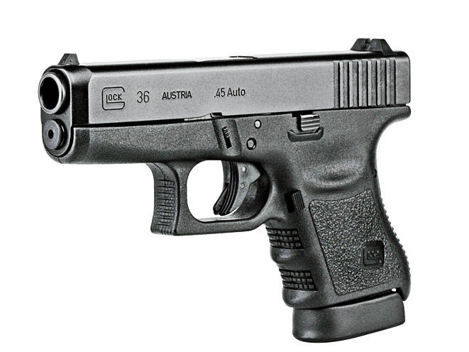 In the late 1990s, GLOCK answered the call for a .45 AUTO pocket model truly suitable for pocket carry. The G36, introduced in 1999, gave up four rounds and its double-stack magazine for a single-stack, six-round capacity, but it also gained a grip frame and width that was narrowed to only 1.10 inches. In fact, this is still the narrowest large-caliber GLOCK ever. While maintaining the same 3.77-inch barrel as the GLOCK 30, the GLOCK 36 came in slightly longer at 6.96 inches but lighter for concealed carry at only 22.42 ounces (empty) and shorter in height at 4.8 inches. The GLOCK 36 remains among the smallest .45 AUTO semi-automatic pistols ever produced.