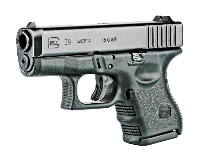 In 2003, Ernest Durham and Gaston Glock designed the company’s own proprietary caliber, the .45 G.A.P. Created as an alternative to the .45 AUTO, the cartridge is essentially a shortened .45 AUTO to allow for a more compact pistol design while providing a round with equal bullet size and velocity. This led to the G37 introduced that same year and the subsequent compact Glock 38 and subcompact Glock 39 versions in 2005. The Glock 39 is narrow at 1.18 inches, with a single-stack, six-round magazine, and it has a height of just 4.17 inches and a length of 6.49 inches. With a shorter 3.42-inch barrel and a weight of 24.18 ounces unloaded, the Glock 39 is one of the smallest large-caliber models in the GLOCK line.