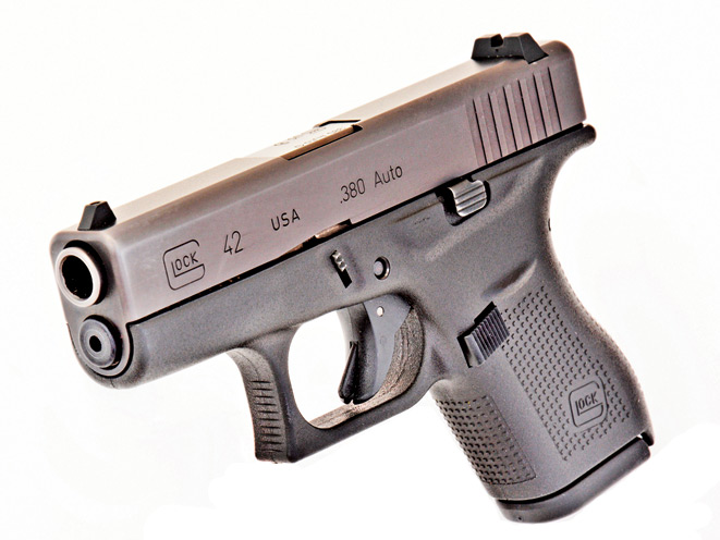 Civilian handgunners have for a long time been voicing a desire for a GLOCK chambered in .380 AUTO. In fact, GLOCK has been manufacturing a .380 AUTO model for years, the Glock 28, but it has only been available to U.S. law enforcement. With the debut of the Glock 42 in 2014, we now have a new .380 AUTO subcompact with the smallest frame, slide and barrel length GLOCK has ever offered. The Glock 42 offers all the advanced features of the arms-maker’s subcompact line in a small, easily held frame size that offers every desirable feature for a .380 AUTO pocket pistol, including dovetailed, white-dot sights, an easily operated slide and magazine catch, and a slide that locks back after the last round is fired. The Glock 42 employs a dual recoil spring assembly unique to the model and a cold-hammer-forged, 3.25-inch barrel. The Glock 42 measures 5.94 inches in overall length, a very pocket-friendly 0.94 inches in width, 13.76 ounces in weight, and it has a capacity of 6+1.