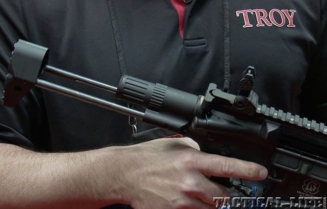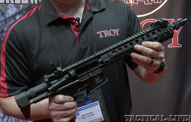 The short-barreled rifle features a forged lower receiver, an M4A4 flat top forged upper receiver, M4 feed ramps, an enhanced trigger guard, Troy’s Ambidextrous Safety Selector, a manual lever safety with indicator markings on both sides of receiver and a Mil-Spec hardcoat anodized finish.