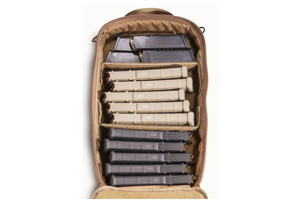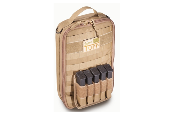 The Tuff Inline MOLLE Mag Bag is a padded case made of 1000 Denier Cordura with a polymer-reinforced rear panel that holds both rifle and pistol magazines. The interior measures 13″ x 9.5″ x 3″. The bag includes :3 removable dividers allowing you to partition rifle and handgun magazines, adjustable shoulder strap, MOLLE straps across front and back, 2 D-Rings at bottom