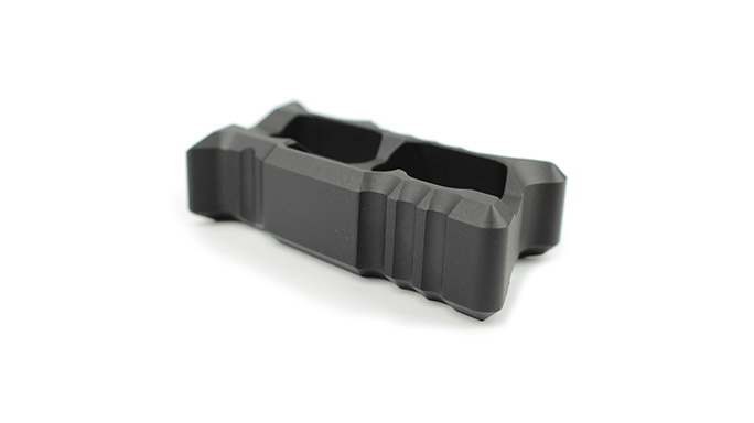 The HALO MiniVert boasts a slight angle and superior ergonomics that enable you to shoot with confidence. Its lower lip extension lets you hold the grip either traditionally or by tucking the pinky behind. Meanwhile, an aggressive side knurl on its lower portions allows for effective yaw control when operating the firearm. Its chamfered edges provide a smooth feel for the end user, while chamfered holes allow for finger placement inside.