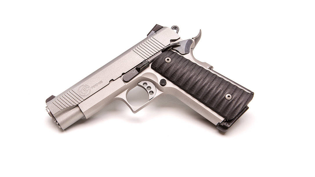 The slide also has a lowered and flared ejection port for optimum reliability as well as three-dot Novak sights that are easy to acquire and align. Moving down the frame, you’ll find a beveled dust cover (an accessory rail can be ordered for another $100), a squared triggerguard and an upswept beavertail grip safety, which provides for a high hold. The frontstrap is smooth, with the flat mainspring housing has subtle texturing. The mainspring housing is nested within with grooved G10 grip panels that are longer than the frame, forming a sort of magazine well for fast and smooth reloads.