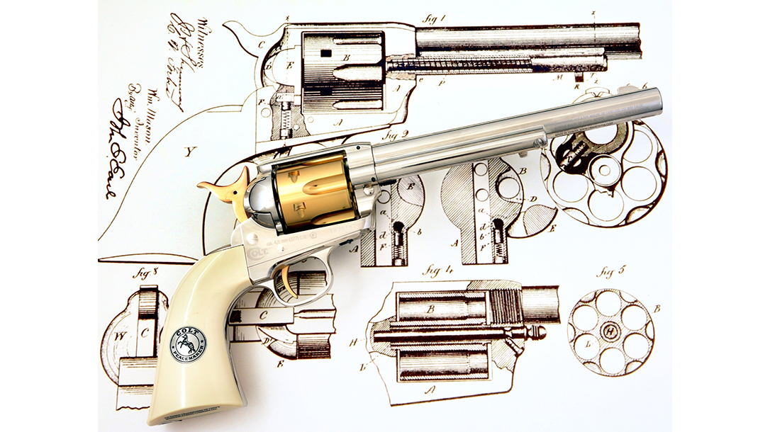 In the 1870s, a 7½-inch-barreled Colt Peacemaker sold for around $18. Nickel plating was an extra $2 to $2.50, and gold plating could add another $2 to $3. In creating its superb CO2 Peacemakers, Umarex and Colt did not wait long to introduce nickel-plated models back in 2015, and late last year they added a nickel and gold, 7½-inch-barreled, pellet-firing model stocked with attractive aged faux-ivory grips and inlaid Colt Peacemaker medallions. As non-engraved handguns go, this is one sharp-looking revolver and only $20 more than the all-nickel 7½-inch-barreled model.