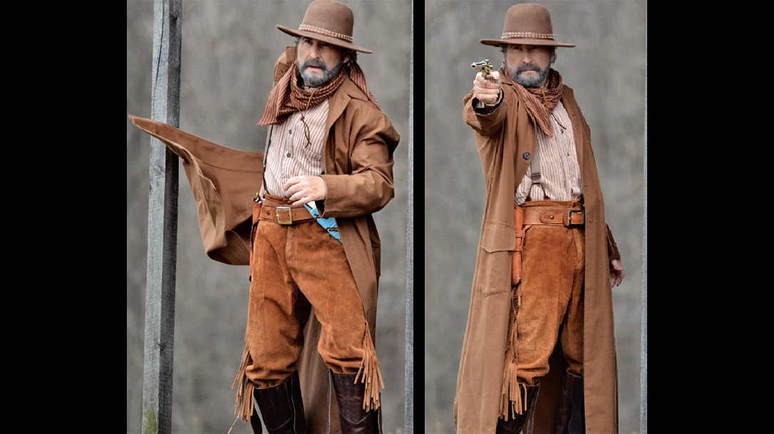 In filming a Western, a little added drama is needed, especially in a gunfight, and in fact, if one were wearing a long duster, it would have to be thrown back to clear the holster. In my action sequence drawing the Umarex Colt Peacemaker, the flaring coattail adds to the effect as it would in a film or even here in a still photo (shown at right). And there really weren’t “fast draws” in the Old West. The holsters just weren’t designed for it, especially in the 1870s. They were built to cover and protect the gun from the elements. Guns sat low in the holster because the throat was cut shallow to cover almost all of the triggerguard, like the copy of an 1870s holster I’m wearing in the photos. It was copied from an original by Chisholm’s Trail.