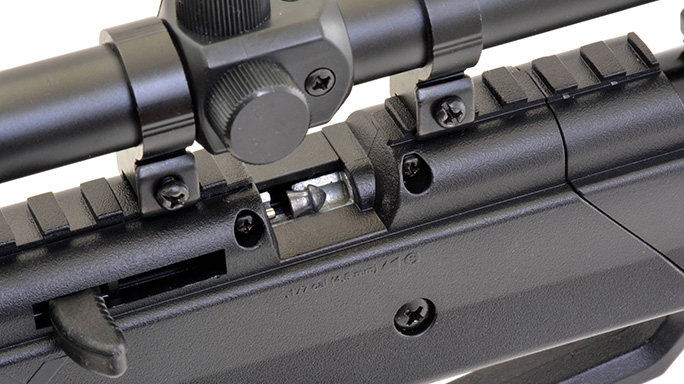 housing is ambidextrous and can be manually set to “safe” with the trigger finger by simply pulling it back. It also automatically sets to “safe” with the first pump of the action lever. The back of the safety protrudes into the triggerguard and can be released by pushing it forward with the trigger finger. BBs are loaded from a covered port on the left side of the receiver (up to 75 steel BBs) while .177 caliber pellets are loaded individually at the breech by pulling back the bolt on the right side of the receiver.