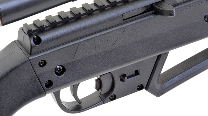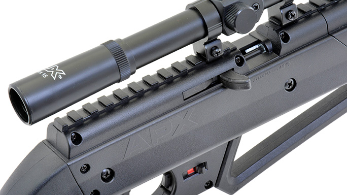 The adjustable rear sight easily picks up the red fiber-optic front sight mounted on top of the gun’s sleek muzzle brake. In sighting with either open sights or a scope, the rifle’s ergonomic shoulder stock and rubber-textured comb allow for a very comfortable and solid cheekweld. Another modern feature is an integral, top-mounted scope rail. In fact, the NXG APX kit comes with an Umarex 4×15 scope! The rail provides a positive lock to keep the scope on zero once it’s dialed in. All of these features combine to make shooting the NXG APX a target-busting experience for shooters of all ages.