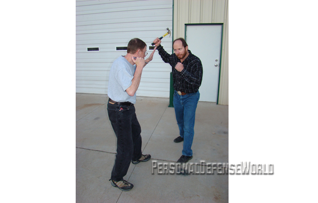 In my research on personal protection, I have watched countless videos of people being attacked with weapons. Regardless of ethnicity, culture or experience, people seem to be hard-wired to fight in the same basic ways — especially when using short, pointy, knife-like objects like pens. Under stress, we typically lead with our weak side and use our non-dominant hand to probe, grab and gauge distance before striking with caveman-style overhand or underhand blows with our strong side. For natural right-handers, it’s a repetitive left-right, left-right cyclical action. Renowned close-combat authority Kelly McCann referred to this pattern as “cycling,” so we’ll also do so here.