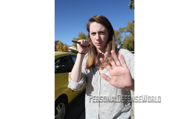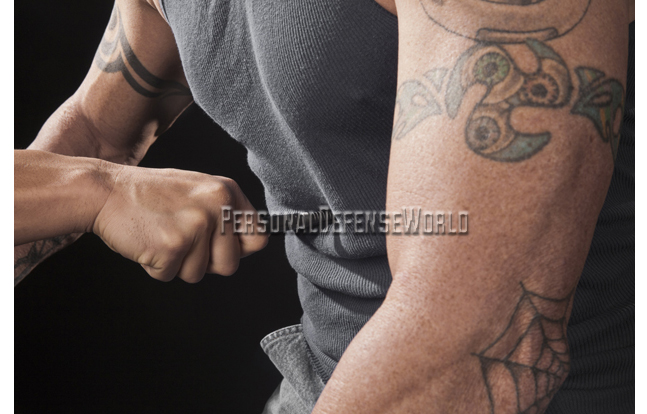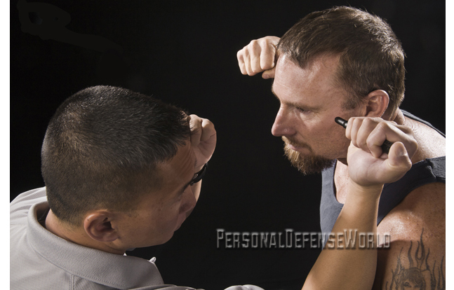 Once you understand the mechanics of basic cycling, practice them in a defensive context. For example, if an attacker strikes at you with the right hand, use the extension of your left palm to check, parry or preemptively strike the attacker to keep his or her strike from connecting with you. The best way to do this is to hit the attacker’s face with your open left palm, covering the eyes and turning the head toward the attacker’s right shoulder. Rocking the head backward and turning toward the striking shoulder makes it impossible for the attacker to complete a strike with any power. Done properly, this also covers the attacker’s eyes so he or she never sees your strike with the pen coming. Take advantage of that, and strike with full power at the face, the ears, the collarbone, the sternum or another appropriate target.