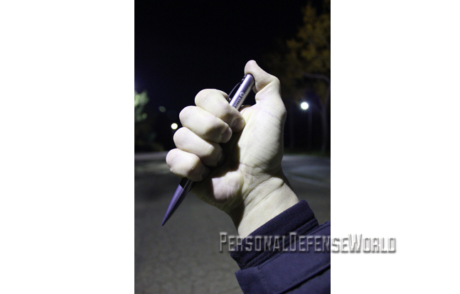 Reverse Grip: This is the most commonly seen tactical pen grip. Also known as the icepick grip, it is assumed by making a fist around the pen so the pointed end extends from the little-finger side of your hand. The cap end should extend slightly above the index-finger side of your hand and should be capped with your thumb to ensure the pen doesn’t slide in your hand on impact. You can also move your thumb down to your fist to use the cap end as an impact surface. The reverse grip allows you to strike with extraordinary power using natural gross-motor skills. And these striking actions translate easily into hooking motions that can be used to redirect and clear an attacker’s limbs to create more opportunities for striking.