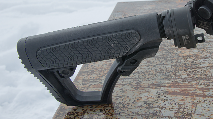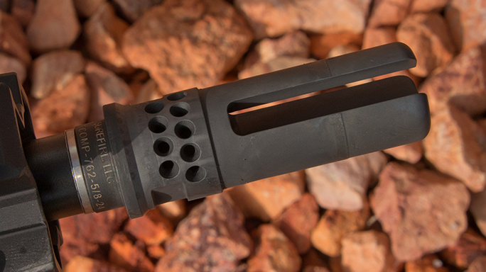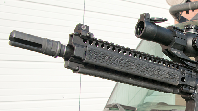 Surrounding the barrel and pinned, low-profile gas block made from hardened steel is Daniel Defense’s 9-inch DDM4 Rail, which provides a super-strong yet light platform for mounting accessories.