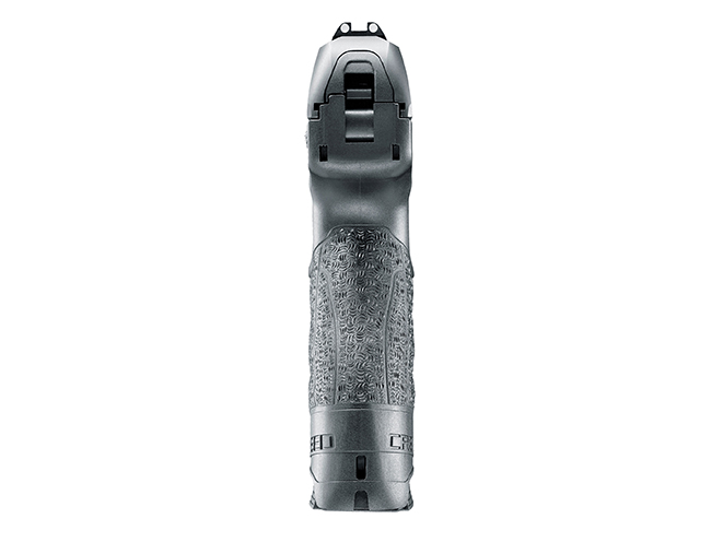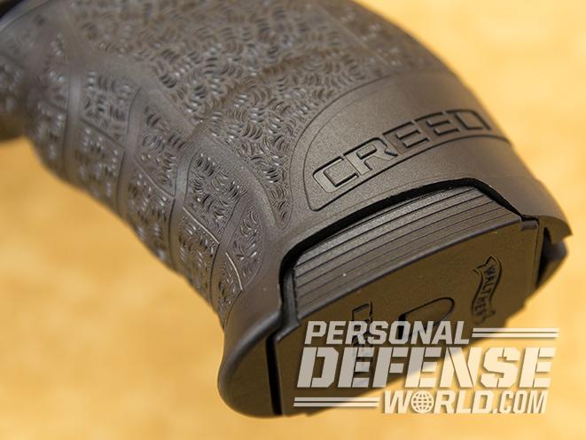 The Walther Creed has a large portion of the grip cut away at its base. Each magazine uses a relatively tall baseplate that tapers in toward its top, forming a pyramid-like slope. This textured slope fits into the frame cutaway and offers an excellent grip on the magazine should you ever need to strip it out of the gun after experiencing a malfunction. The baseplate is large enough to grasp while wearing gloves.