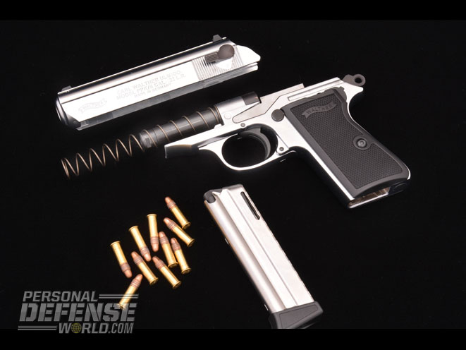 Walther’s original .22 pistols were manufactured up until 1945, but the war years curtailed their production because .32 and .380 ACP models were issued to German military officers as sidearms. (There is an entire class of collectors specializing in WWII-era Walther PPK pistols that have specific proof marks showing they were issued to German police, political officials and others during the war. Most were chambered in .32 ACP.) Additionally, due to the gun’s decade-long production prior to WWII, the PP and PPK were equally popular with the French Resistance and others who found the compact Walthers provided adequate firepower and easy concealment.