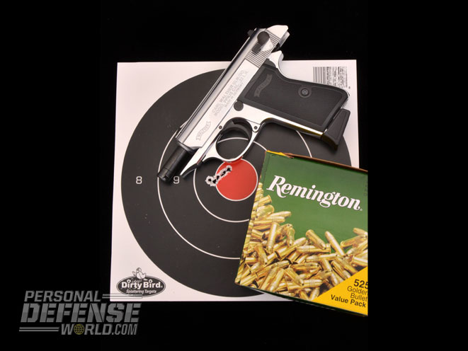To test the pistol’s accuracy, I fired three popular .22 LR ammo brands—Winchester’s Super-X, Remington’s brass-plated hollow points (HPs) and Federal’s AutoMatch—at 7 yards. The rounds cleared the chronograph’s traps at an average of 899 fps, 880 fps and 925 fps, respectively, from the Walther’s 3.3-inch barrel. The most accurate was the Remington ammo, placing five shot into 0.75 inches, followed by Federal with a 1-inch group and Winchester with a 1.75-inch group. The PPK/S .22 isn’t a target pistol, but when a gun can place five rounds into an inch, even when you’re as close as 7 yards, there’s nothing much to complain about.