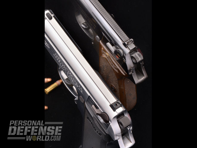 Compared to my 1960s-era .22 LR PPK, which has a shorter but wider grip frame than the PPK/S, the new model stacks up nicely and looks similar overall. One of the more noticeable differences, aside from the beautiful, old, high-polish blued finish and elegant brown plastic grips, is a different barrel and extractor design. But when you start comparing features, the two guns, though nearly half a century apart, have much more in common—from the traditional wavy grooves on the slide’s topstrap, to the 22 deep serrations in the rear of the slide, the round, knurled hammer (the new model lacks some of the fine detail), the checkered magazine release and the safety/decocker mechanism.
