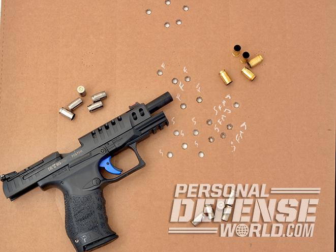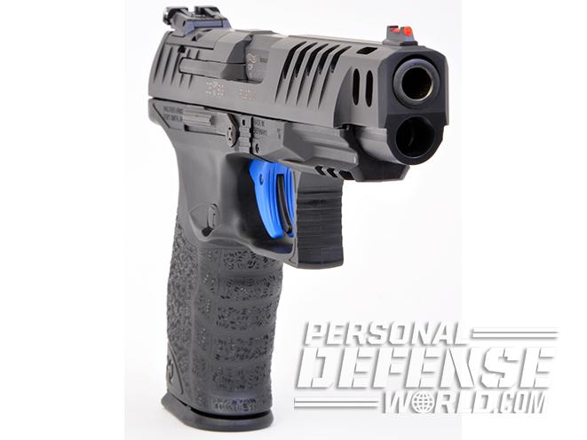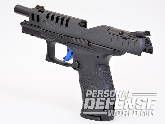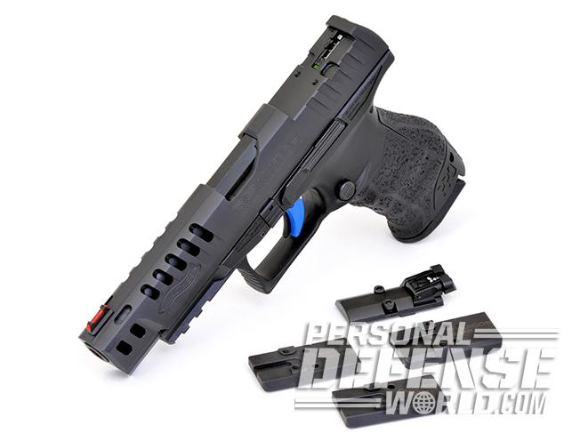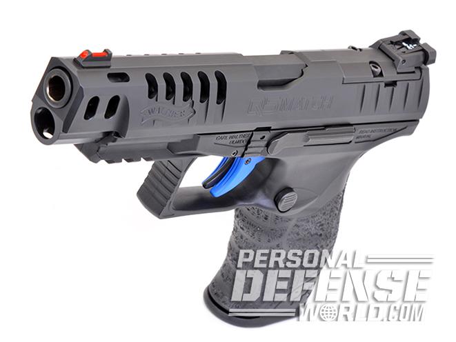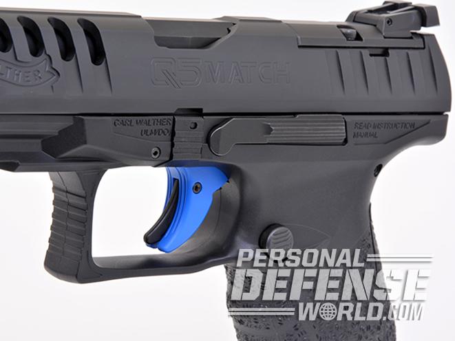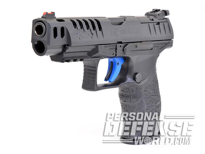 The bright blue Quick Defense trigger not only sets this model apart from the rest of the PPQ M2 line, but it also levels the playing field with many of its competitors. The match trigger only requires 0.5 inches of take-up (including the blade safety) and has a short 0.125-inch reset. The trigger pull on my test gun averaged 4.89 pounds. This compares to the 5-inch-barreled PPQ M2’s average trigger pull of 5.15 pounds (from my Combat Handguns test back in 2013). As a point of reference, the single-action trigger pull on my Walther P99 averages 6.25 pounds. So, as you can see, this blue trigger is light, fast and exactly what you’d want in a competition pistol.