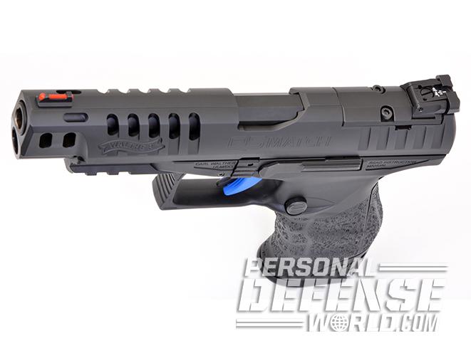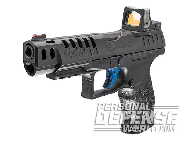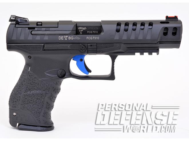 The Q5 Match is a production-class competition version of the 5-inch-barreled PPQ M2 introduced in 2013. The original PPQ design—let’s call it the PPQ M1—was an “evolution” of the circa-1997 Walther P99, the arms-maker’s first polymer-framed, striker-fired semi-auto, and when the first PPQ was introduced in 2011, it was essentially a direct upgrade based on the P99 platform. The new design eliminated some of the features that made the P99 desirable; one of the most noteworthy was the DA/SA trigger and decocker, which was replaced on the PPQ with an SAO trigger incorporating an integral blade safety. Walther named its variation of the Glock design the “Quick Defense” trigger system, which was actually developed for the P99 QA (Quick Action) model. The trigger safety eliminated the “technical” need for the P99’s decocking system, which in the minds of many remains one of the P99’s best features. The trigger on the PPQ series also eliminated the second-strike capability as well as the P99’s striker status indicator, which protruded from the back of the slide when the action was cycled. On the plus side, you gained the lighter “Quick Defense” trigger, improved front and rear slide serrations and enhanced grip texturing on the polymer frame.