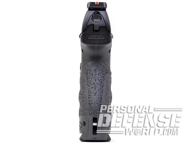 The Q5 Match also comes with a medium- sized backstrap panel in place, plus a smaller panel to decrease the grip’s depth and a larger panel that increases the curvature of the grip frame for the web of the hand. For me, the medium panel is a good fit, placing the strong-hand thumb over the top of the middle finger when using a one-handed hold. This is an optimum grip position. Using a traditional two-handed hold, this also places the strong-hand thumb over the support-hand thumb.