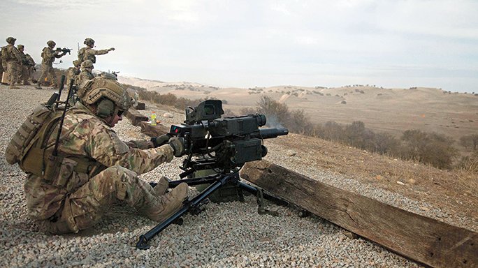 MK 47 Striker: The MK 47 modernizes grenade tactics by adding a programmable air-burst feature. The operator uses a computer to calculate a target’s position, then programs the 40 x 53mm grenade to detonate above or near the target. The weapon weighs 40 pounds and launches at a rate of 200-plus programmable grenades per minute.