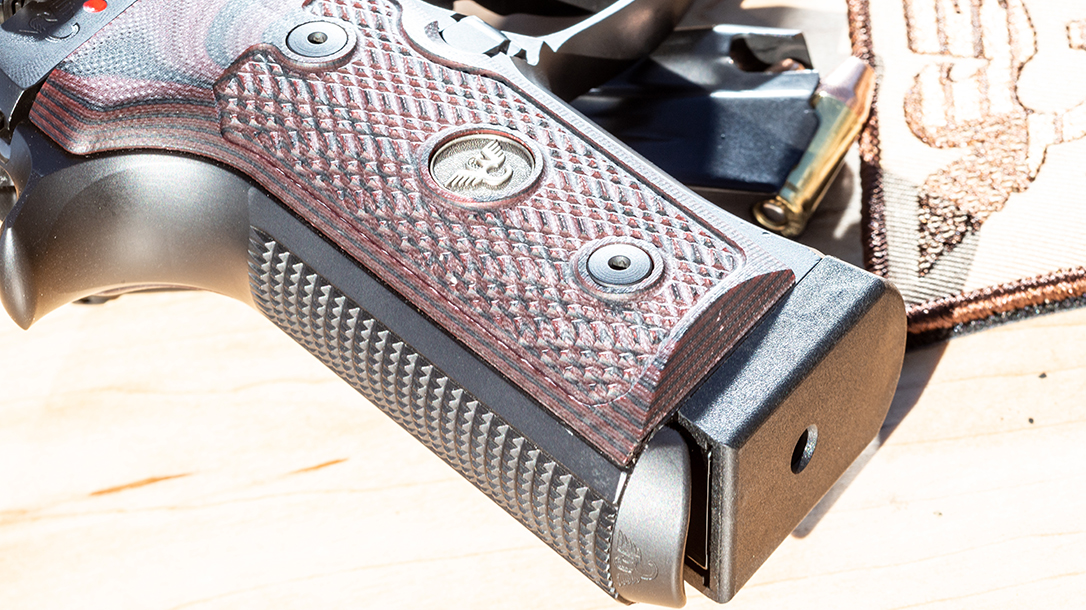 Wilson then checkers the frame front and rear, following basically the same pattern as a Beretta 93 model. Once the gunsmithing is complete, the frame is refinished in matte Black Armor Tuff and dressed with tasteful Black Cherry G-10 grips.