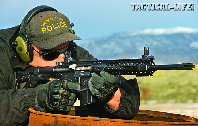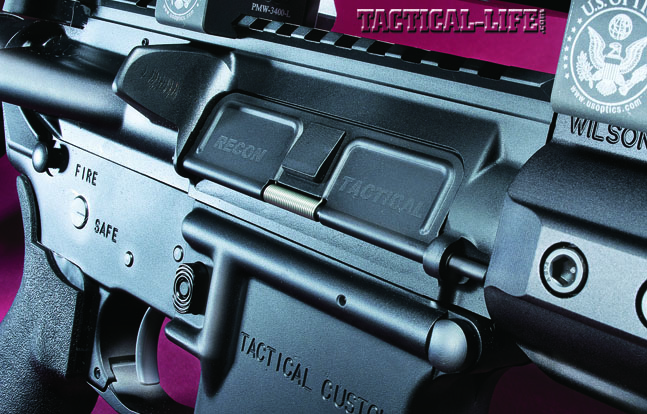 The rifle provided for testing was a standard Recon Tactical with a forged upper and lower. It was fitted with a 16-inch match-grade barrel using a six-groove 1-in-12-inch twist. It is threaded 5/8-24 and fitted with an Accu-Tac flash hider. The medium-length gas system was contained in Wilson’s carbine-length T.R.I.M. rail with removable and movable sections. The trigger is Wilson’s excellent TTU with a 4-pound, single-stage pull. The stock is a Rogers/Wilson Super-Stoc, which allows for multiple positions and locks easily into place. The bolt carrier is Mil-Spec and NP3-coated for reliable functioning. Coated in Armor-Tuff, this rifle looks fantastic.