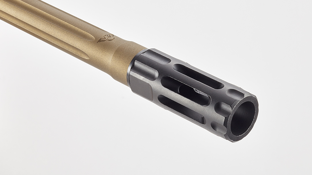 The 10.38-inch TRIM handguard is the same size as those used on Wilson’s 5.56mm ARs. It also has thicker aluminum in key stress areas. In addition, it also uses much stronger 5/32 Allen-head screws to secure it to the barrel nut than competitive handguards. There’s also a shell deflector on the upper to protect left-handed shooters from ejecting brass; the mag well is deeply flared for quick reloads.