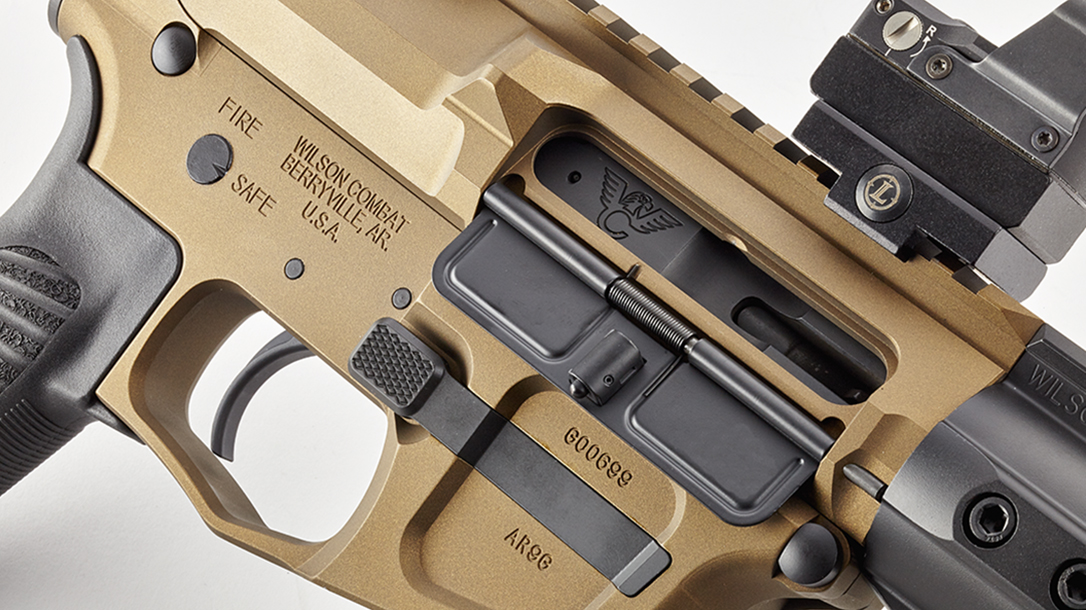 The rifle’s fit and finish highlight its quality. The attention to detail is evident, starting with the tightly fitted upper and lower receivers made from a billet of 7075-T6 aluminum. You can’t help but appreciate the solid feel that tightly fitted receivers give an AR, particularly when the two push pins can be removed for cleaning without requiring a hammer and punch. Machining marks were nowhere to be found, and the finishes were expertly applied. Aluminum components are hardcoat anodized before being coated in Wilson’s Armor-Tuff, a Cerakote-like finish. Carbon-steel parts like the barrel are Parkerized before being finished in Armor-Tuff, providing plenty of rust resistance.