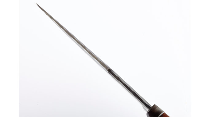 “My laminated steel blades are unique in that they have a single piece of carbon steel forge welded between two pieces of stainless steel,” Foster says. “This is also referred to in Japanese blades as ‘san-mai’ or literally ‘three layers.’ There are basically two main advantages to my laminated steel blades. The first is that at the temperatures used to harden the carbon steel core, the stainless sides remain soft and support the hard center. This makes the knife very sharp at the edge, but very tough overall.