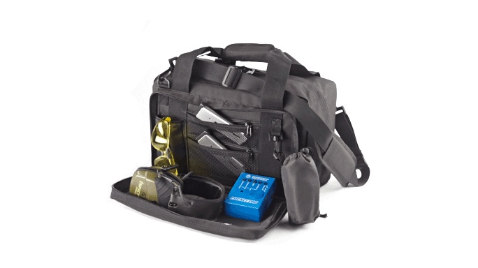 The Deluxe Range Bag measures 14.5 inches long, 10 inches tall and 8 inches wide. The carry handles have 2-inch wide webbing with a padded grip. The bag also features a 1.5-inch shoulder strap.