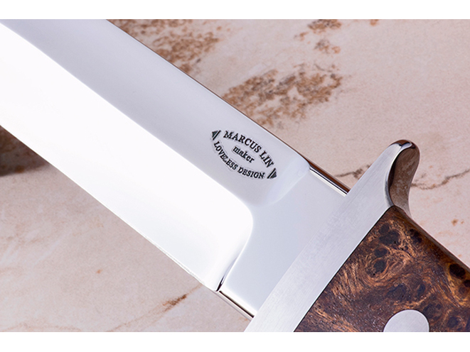 Influenced by the work of the legendary Robert W. Loveless — a pioneer of handmade high-performance knives from modern materials — the “Dixon Fighter” boasts a 6″ blade made of mirror polished ATS-34 stainless steel. The blade has a thickness of .190″. This knife also exhibits incredible double-hollow grinding. Meanwhile, the handle material is flat sawn, polished stabilized black walnut burl, which serves as a great contrast to the stainless steel blade. This knife has an overall length of 11″ and a weight of 8.6 oz. It also comes with a custom hand-stitched sheath. Simply put, the Marcus Lin’s “Dixon Fighter” serves as a fitting tribute to the work of Loveless.