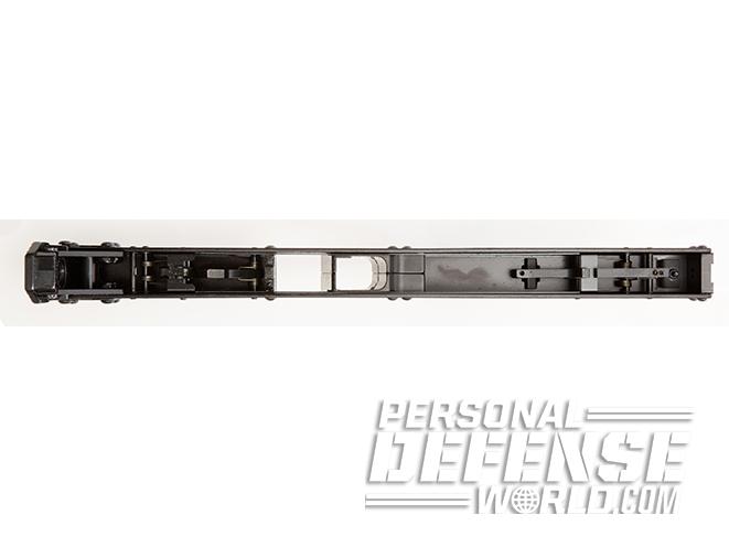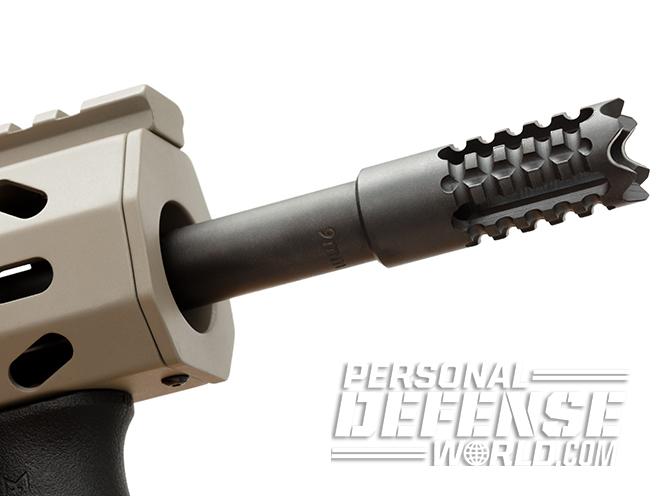 The upper receiver is an octagonal, stamped-steel tube that houses the blowback-operated bolt, barrel and requisite recoil spring assembly. Charging handles protrude from both sides of the receiver, making it ambidextrous. The forward portion of the upper receiver’s sides and bottom incorporate M-LOK-compatible slots. A foregrip is installed for ease of use.