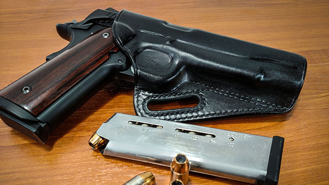 The Galco holster is quality leather that becomes more comfortable over time, and it’s easy to conceal with everyday clothing. I also like carrying a full-sized firearm because it comes with a standard-capacity magazine. If I need to draw my weapon in self-defense, I don’t want a smaller-capacity magazine limiting my efforts.