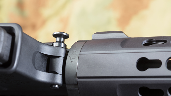 YHM’s carbine-length KR7 KeyMod handguard surrounds the barrel and pistol-length gas system. It mates up securely with the upper receiver, offers plenty of space for accessories and helps protect your hand from a hot barrel.