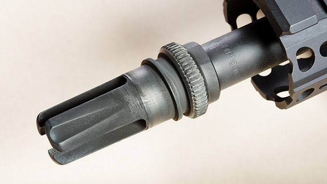 This particular weapon, the YHM-8030, was built upon a forged 7075-T6 aluminum lower receiver with a matching A3-style flattop upper. The 9.1-inch barrel was made from 4140 steel with a 1-in-8-inch twist rate and M4 feed ramps. The barrel is also treated with a Melonite QPQ finish to help resist corrosion. The muzzle has 5/8×24-tpi threading and comes tipped with YHM’s Phantom flash suppressor.