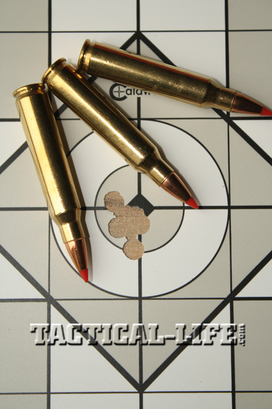 Firing at 100 yards from a benchrest, I found the Desert Enforcer capable of sub-MOA accuracy with the right load. As always, it is imperative to match the ammunition to the rifle for best results. As expected with the lower twist rate, a lighter match-grade bullet—in this case the 60-grain V-MAX from Black Hills—performed the best, yielding two sub-MOA groups, including one of 0.6 inches. The outstanding Hornady 75-grain BTHP also delivered at least one sub-MOA group and would likely do better with the 1-in-7-inch twist rate option.