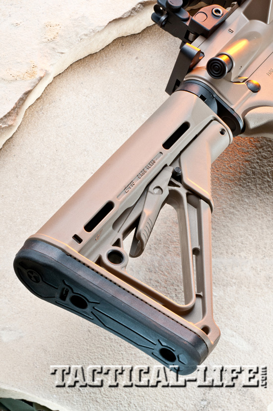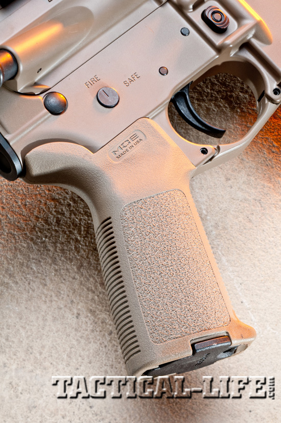 The rest of the upgraded furniture on the Desert Enforcer is all Magpul, including the Magpul CTR carbine buttstock (on a commercial-sized buffer tube), which can be adjusted for six different length-of-pull positions to accommodate shooters with different statures or those wearing heavier clothing. Also included is the Magpul triggerguard, which is enlarged for easier glove use, and the Magpul MOE pistol grip, featuring internal storage space for extra batteries of small spare parts. Both come in Dark Earth. Finally, YHM included a black 30-round Magpul PMAG.