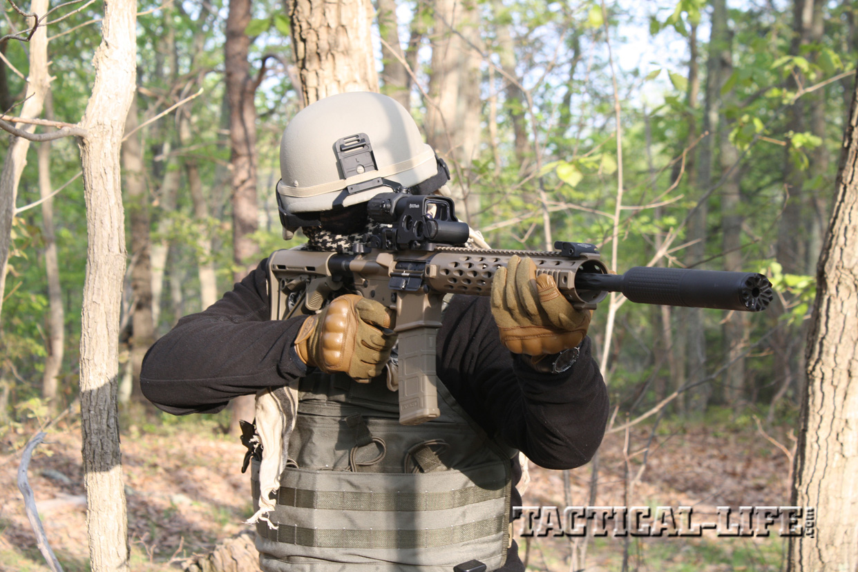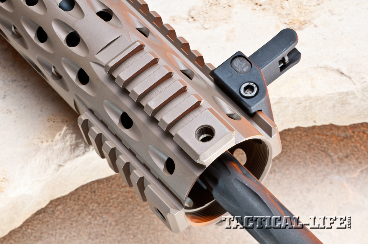 The Enforcer’s 16-inch barrel is made from 4140 steel that has been heat-treated to 25-32 Rockwell hardness, and it features a very distinct diamond-fluted pattern, which aids in heat dissipation by providing a larger surface area and reduces weight while maintaining the barrel’s strength and rigidity. My test Desert Enforcer arrived with a 1-in-9-inch twist rate, but a faster 1-in-7-inch twist rate is also available for heavier bullets. I found that the 1-in-9-inch twist rate—which means that the bullet completes one full rotation for every 9 inches of barrel length, stabilizing a wider range of bullet weights, including very low-weight ammunition—performed very well, yielding some sub-MOA groups.