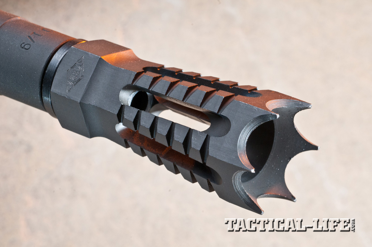 The Desert Enforcer comes with YHM’s popular Annihilator flash suppressor, which reportedly eliminates 99 percent of visible flash and, indeed, on the range I saw none. This muzzle device is very aggressive, with several sharp points that can be used as a standoff device as well as for emergency glass breaking. While there is a significant intimidation factor built into this flash suppressor, users should exercise care, as it does have a slight flare and is very sharp, which could cause damage to upholstery, a range bag or a person.