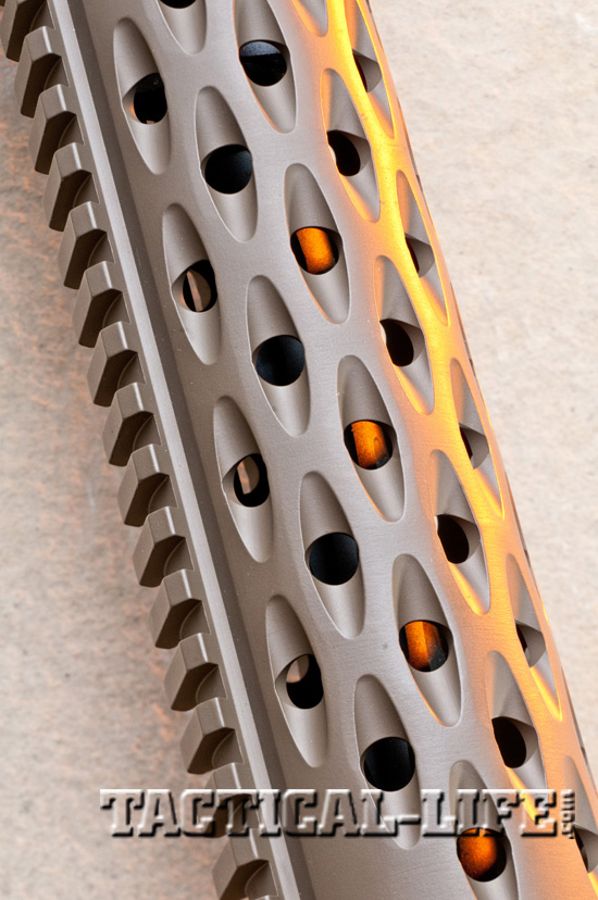 The well-ventilated handguard features a very sleek and smooth design, with 2.5 inches of machined Picatinny rail at the 3, 6 and 9 o’clock positions at the front for mounting accessories such as lights, lasers and bipods. This handguard is a bit narrower and thinner than most handguards out there for improved comfort, especially for those with smaller hands. The rear of the handguard features two steel anti-rotation screws for added strength and a secure fit. The handguard itself is made from 6061-T6 aluminum and hardcoat anodized to mil-spec.