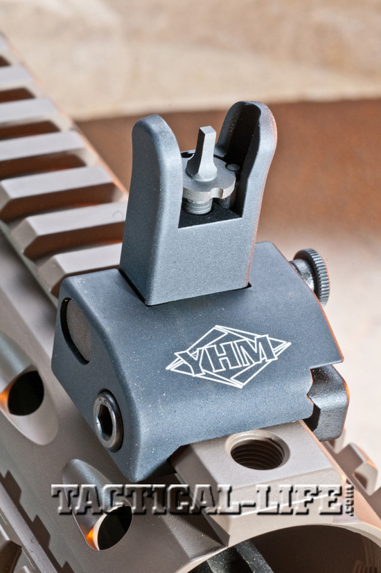 YHM’s Quick Deploy front and rear iron sights, a standard feature for this rifle, are made from aircraft-grade aluminum. They deploy very quickly with a simple quick-deployment push-button release/lock. Both sights have the standard AR peep configuration, and are adjustable for windage and elevation. They also lay very flat on the rifle when folded down and, depending on your rings, can be left on and used with optics.