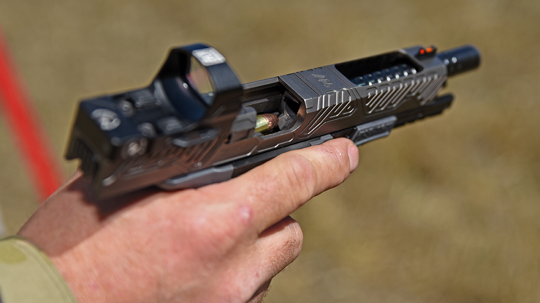 At the heart of the OZ9 is a ZEV Steel Receiver. This solid steel frame is unique to ZEV. It runs the length of the entire pistol, allowing the locking block to be fully integrated. The extended rails in the steel receiver help provide more than double the surface area of contact to the slide. ZEV says that having a singular component for the slide to travel along minimizes vibration and recoil energy by dispersing it along the receiver through the custom grip. A single take-down pin conveniently located at the front of the trigger guard locks the removable grip to the steel receiver.