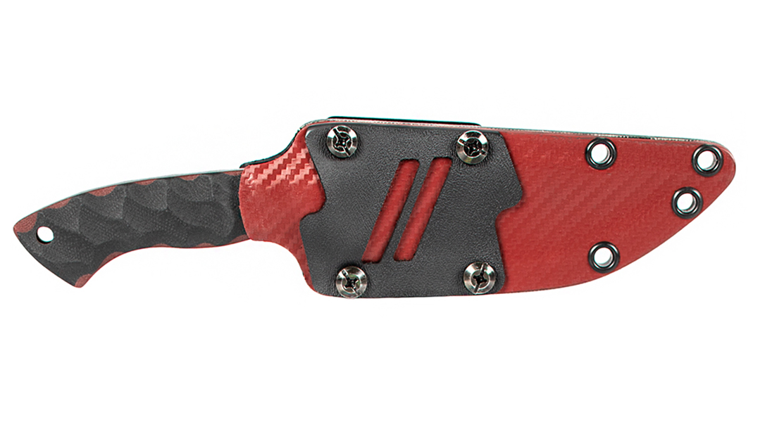The Zev influence in this knife can be seen in its red and black handle, in addition to its slashes cut in the blade. The Kydex sheath in red and black also sports signature Zev slashes. Meanwhile, the belt clip can be mounted either vertically or horizontally for left or right-hand draw, giving you plenty of carry options.